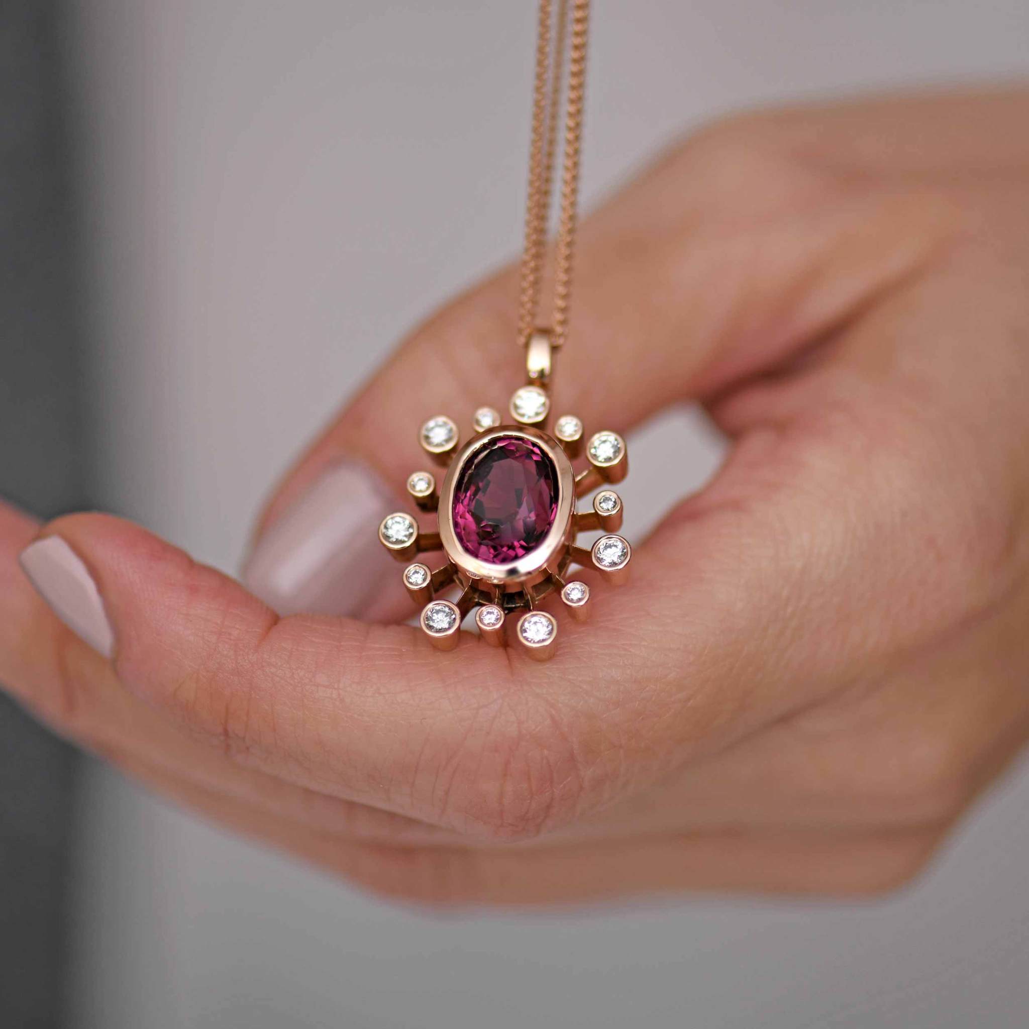 - Fire Flower Rhodolite Garnet and Diamond Fireworks Necklace on hand