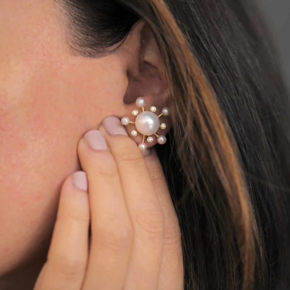 - Bombshell Pearl and Diamond Fireworks Earrings on ear