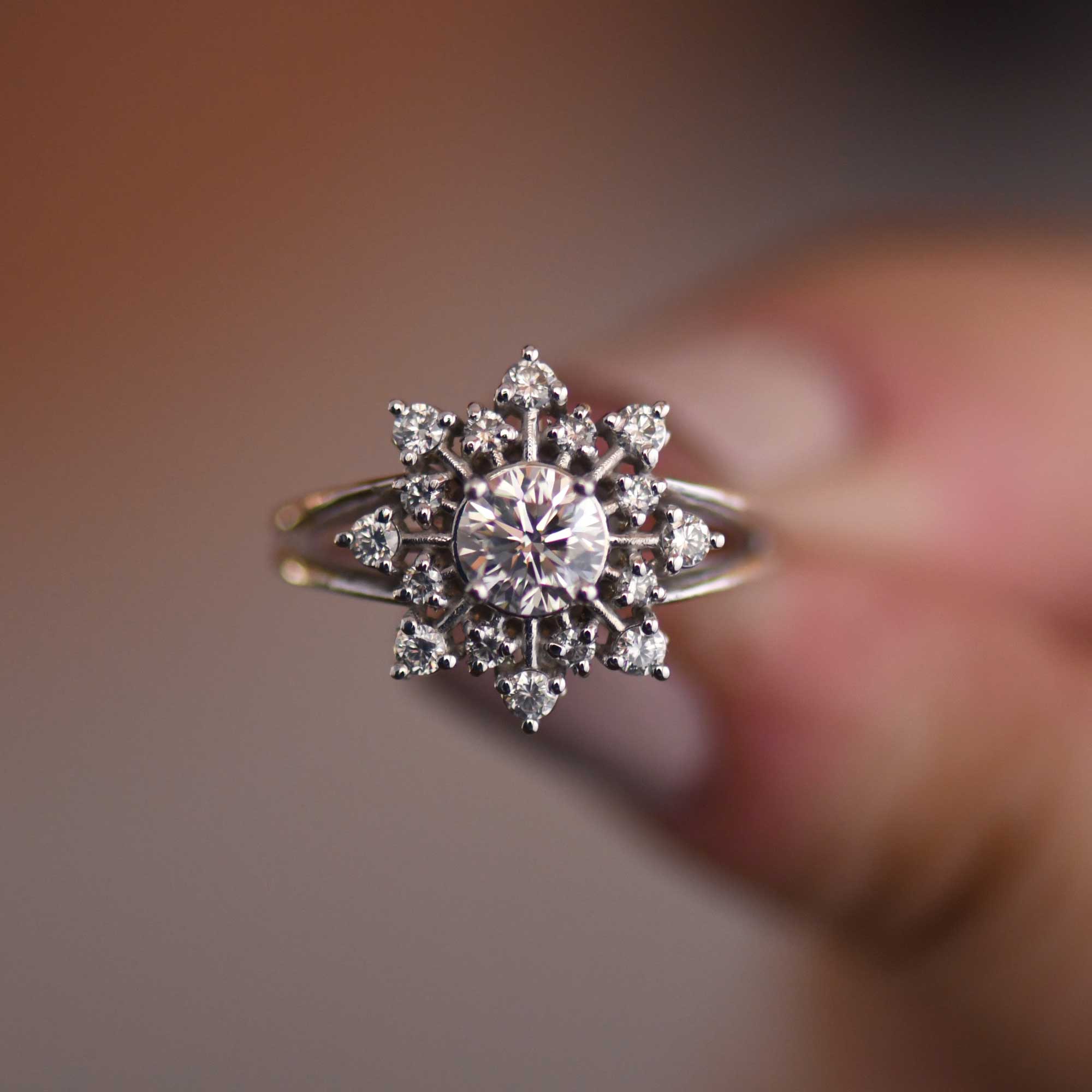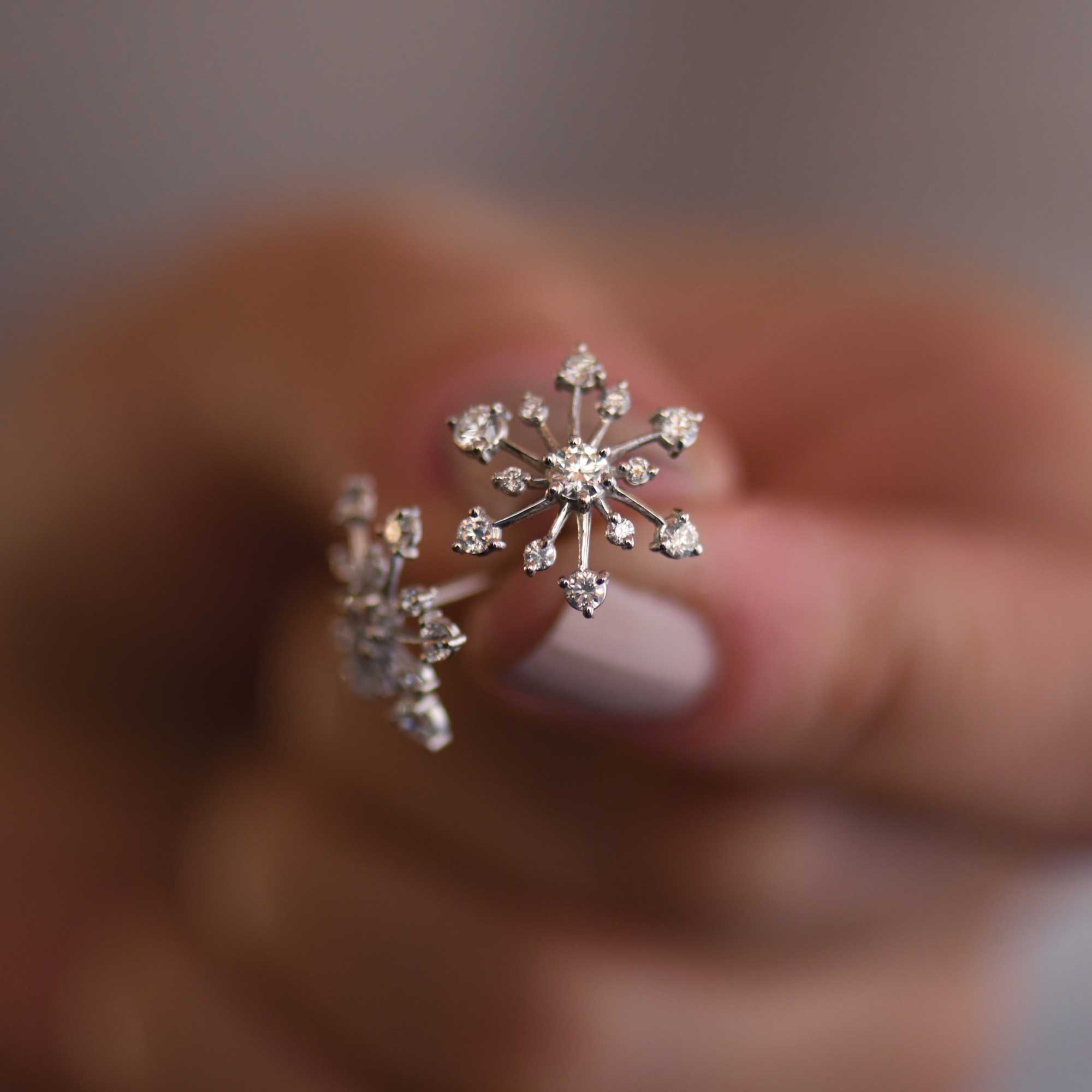 Here you can see how a representation of Northern Lights to the most recognizable snowflake shapes can be unique as we used different jewelry techniques to achieve each unique design. If you look closely at the ring you will notice that even the placement of the prongs that hold the diamonds in place are positioned to make the diamonds look crystallized.