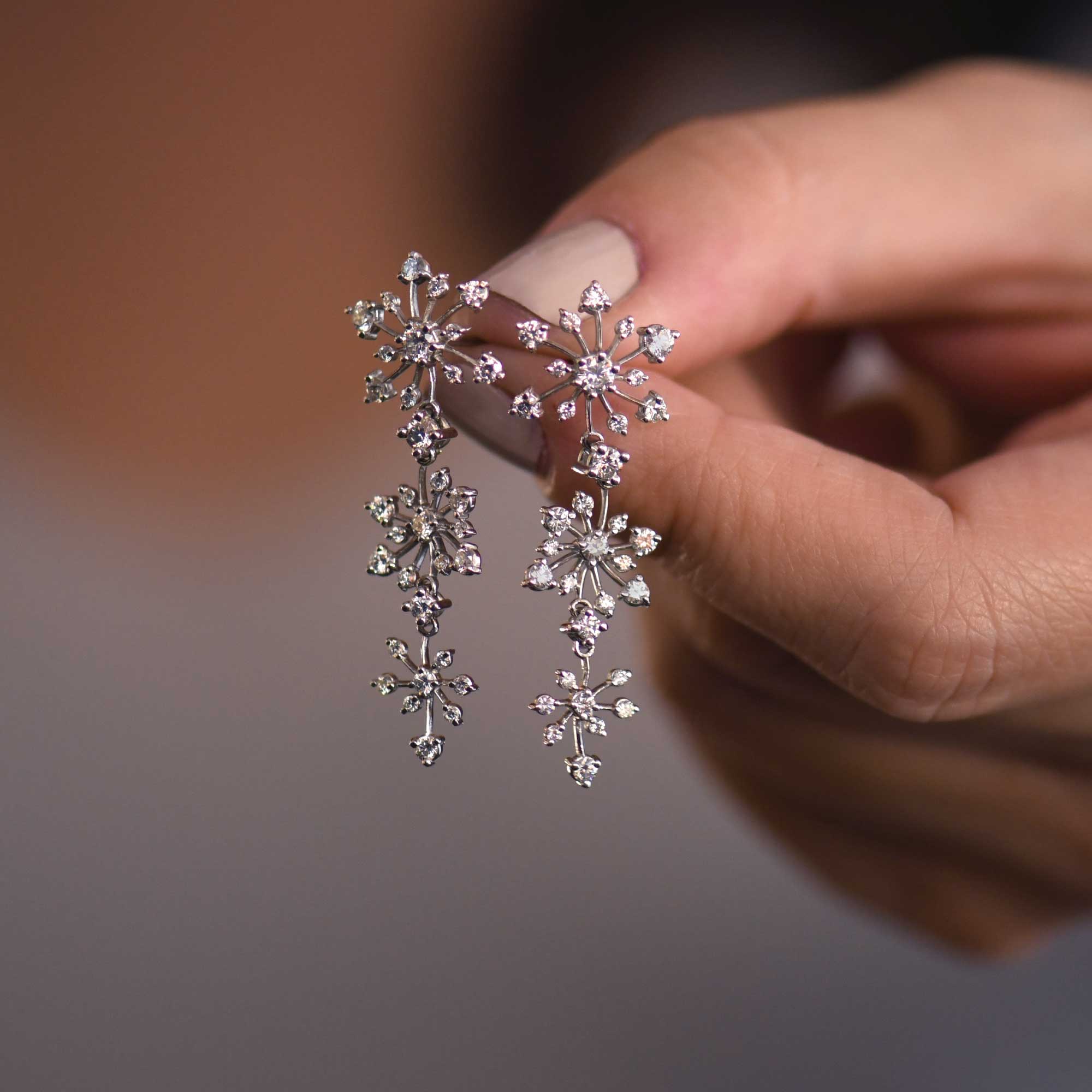 As I progressed into this exploration, I found myself designing concepts of snowflakes in movement. Here you see three such designs that are elongated and use individual snowflakes in a stylized design. From single drop earrings to cascading couture diamond earrings. Our Falling Snow Diamond Snowflake necklace in and of itself is a visual representation of snow falling and landing onto the neckline, hanging softly and elegantly along lines of white gold on base of the neck.